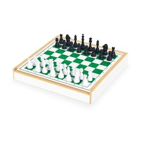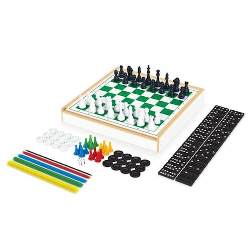 1 estojo em MDF com tampa de deslizar para organizar os jogos. O kit conta com 6 opções diferentes para a diversão: Xadrez, Ludo, Dama, Trilha, Pega Varetas e Dominó. Cada um conta com seu tabuleiro e peças específicas. Além disso, é super prático e fácil pra organizar depois de uma partida bem longa.