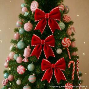 Os laços são confeccionados em tecido veludo de alta qualidade, com acabamento listrado nas bordas em estilo Candy Christmas (vermelho e branco), trazendo brilho e delicadeza na medida certa. A fixação é prática, com arame revestido que permite ajustar e moldar facilmente conforme a sua decoração.