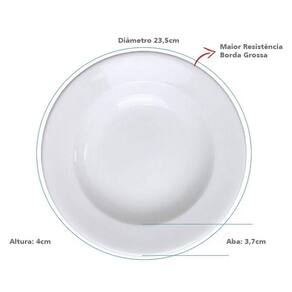 Garantia: 90 dias / Peso: 4,29kg / Cor predominante: branco / Referência: 7891658934433X6 Dimensões de cada prato: 23,5cm (D) x 4cm (A); Capacidade de cada prato: 350ml; Tipo: fundos; Conteúdo: 6 pratos; Material: porcelana.