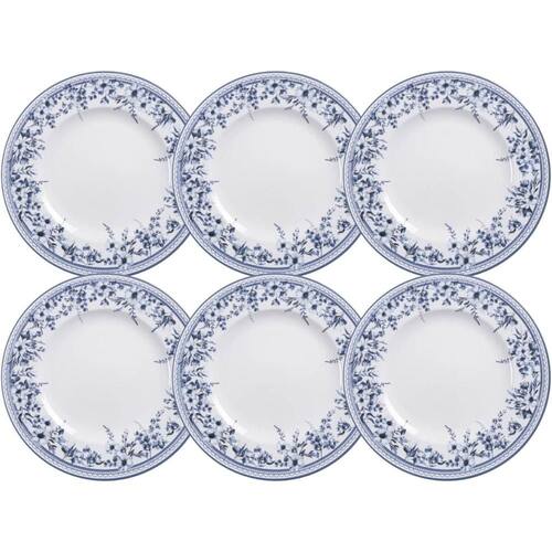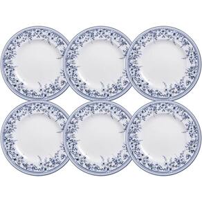 Garantia: 90 dias / Peso de cada: 720g / Cor predominante: branco / Ref: 7794465426484; Dimensões de cada: 28cm (D) x 2,6cm (A); Material: porcelana; Linha: Azzura; Conteúdo: 6 pratos rasos.