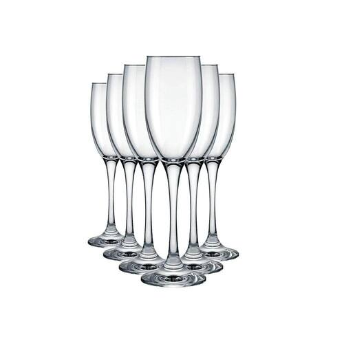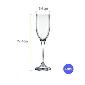 Jogo com 6 taças Imperatriz Nadir, em vidro cristalino, no modelo flute, que favorece a formação de bolhas e direciona o aroma da bebida para o nariz, sendo ideal para espumantes.