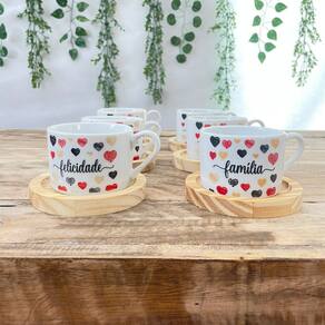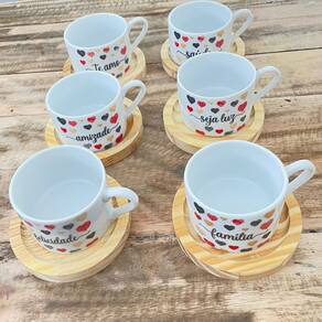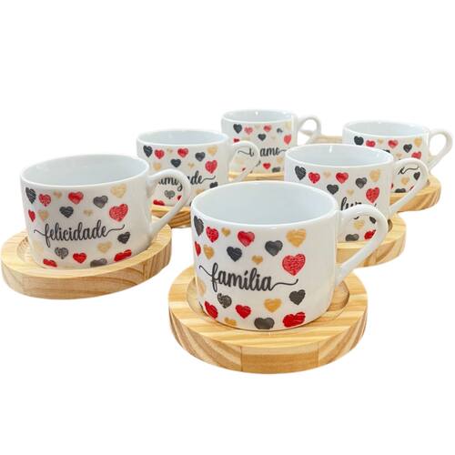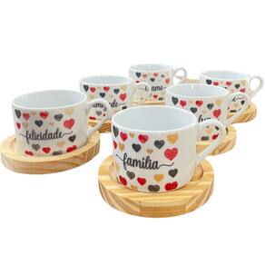 Jogo 6 xícaras 170ml base reta com pires redondo- Frases Motivacionais - Kit PorcelanaContém 6 canecas com design bem interessante, você pode presentear as pessoas que você gosta. Frases: Variadas.Forte resistente, pode ir ao micro-ondas. Ótimas para servir café com leite, água e bebidas em geral. Decalques com queima e fixação em alta temperatura, o que dá um brilho e charme há qualquer ambiente. OBS: Por se tratar de madeira de pinus natural, entre os pires podem existir pequenas variações na tonalidade das cores da madeira. Pode haver variação de tonalidade entre as peças de porcelana devido a diferentes lotes de queima. OBS: Embalagem contem 12 unidades (6 xicaras x 6 pires) Marca: Antilope Decor Porcelanas