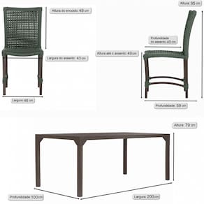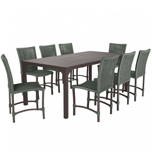 Jogo 8 Cadeiras Cannes Corda Náutica e Mesa Retangular Ripada 2,00m em Alumínio para Edícula, Jardim, Área, Varanda, Cozinha - Pintura Marrom - Verde