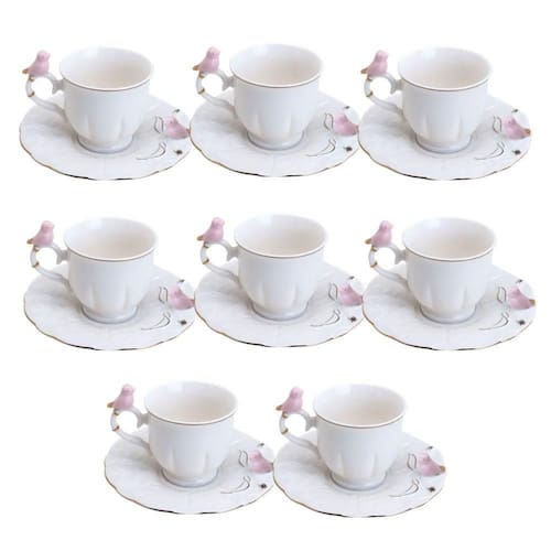 Jogo 8 Xícara de Café Porcelana Rosa e Branca Birds Pássaro com Pires 100ml Wolff