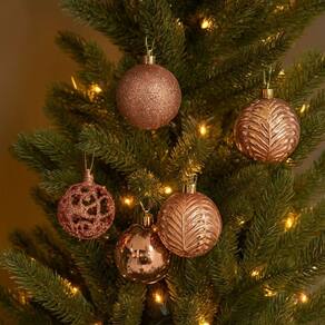 Transforme sua árvore em um verdadeiro espetáculo de elegância com este jogo de 9 bolas natalinas rosê metalizado, com design exclusivo em textura folha palmeira e glitter vazado. Cada peça foi desenvolvida para trazer luxo, brilho e sofisticação à sua decoração natalina.