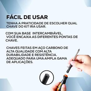 Este conjunto é bastante completo e útil para uma variedade de tarefas que envolvam a manipulação de parafusos, principalmente pelas suas pontas magneticas. Certifique-se de usar a ponta apropriada para cada tipo de parafuso, pois isso ajuda a evitar danificar tanto a ferramenta quanto o parafuso.
