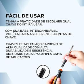 Este conjunto é bastante completo e útil para uma variedade de tarefas que envolvam a manipulação de parafusos, principalmente pelas suas pontas magneticas. Certifique-se de usar a ponta apropriada para cada tipo de parafuso, pois isso ajuda a evitar danificar tanto a ferramenta quanto o parafuso.