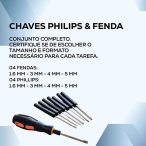 Conteúdo da embalagem: -04 chaves de fenda ponta chata magnética; -04 chave de fenda ponta cruzada magnética; -01 cabo para fixação das chaves; -01 estojo para armazenamento das ferramentas.