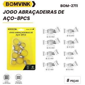 Produto: Jogo abraçadeiras de aço 16 a 25mm com 8 peças - BOM-2711 Marca: Bomvink Descrição: O Jogo de Abraçadeiras de Aço 16 a 25mm com 8 Peças BOM-2711 da Bomvink, é essencial para quem busca eficiência e durabilidade em fixações. Perfeito para projetos profissionais e domésticos, este conjunto oferece uma solução robusta para manter tubulações, cabos e outros itens seguramente no lugar. Fabricadas em aço de alta qualidade, estas abraçadeiras garantem resistência superior ao desgaste e às condições adversas, como umidade e grandes variações de temperatura, prolongando a vida útil de suas instalações. Com um design versátil, elas se ajustam a uma variedade de diâmetros, o que as torna indispensáveis em qualquer caixa de ferramentas. Características: • Variedade de Tamanhos: Cada kit contém peças nos tamanhos 16, 18, 22 e 25 mm, proporcionando flexibilidade para diferentes aplicações. • Material Resistente: O aço utilizado é especialmente selecionado para resistir a corrosões, garantindo uma fixação segura e duradoura. • Multiuso: Ideal para automóveis, máquinas, instalações elétricas e hidráulicas, entre outras aplicações. • Facilidade de Uso: Projetadas para uma instalação rápida e sem exigir ferramentas especiais, o que facilita tanto para profissionais quanto para amadores.Especificações: Material: AçoMedidas: 16,18,22,25. Marca: Não Informado