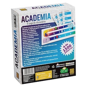 Academia é um jogo que traz diversas palavras bem diferentes da língua portuguesa. Tentando acertar seu significado, os jogadores travam uma emocionante disputa: cada um procurará avançar no tabuleiro e chegar primeiro à casa final.Existem diversas maneiras de pontuar, sendo que o diferencial está no detalhe de que você não precisa conhecer de fato nenhuma das palavras para conseguir vencer a partida, pois é quem recebe mais votos que anda o maior número de casas.Você sabe o que é um agrumularCaso não saiba, não se preocupe. Pois seu objetivo será inventar um significado em que os outros jogadores votem como o correto na rodada Homologação Inmetro: CE-BRI/ICEPEX-N 01264-25-14 Marca: Não Informado