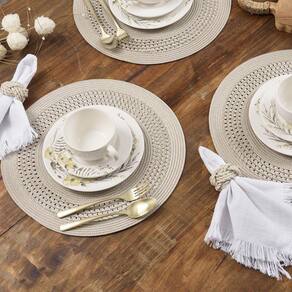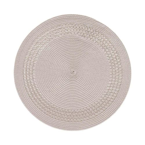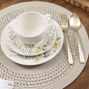 Jogo Americano Copa E Cia 6 Peças Luna Tressê Vanilla Jogo Americano Copa e Cia 6 Peças Luna Tressê Vanilla - Características Gerais do Produto: - Composição: 75% Polipropileno (Plástico) e 25 % Poliéster. - Detalhes: Flexível.; Kit Contém 06 peças.; São práticas e versáteis - Cuidados: Evitar contato com objetos cortantes ou superaquecidos.; Não amassar; Não torcer ou dobrar totalmente o produto.; Não utilizar solventes, abrasivos ou alvejantes.; Limpar manualmente com pano úmido e detergente neutro. - Dimensões (cm): Diâmetro: 38 cm Acompanha o produto: - 6 Peças de Jogo Americano Garantia: - Sem Garantia