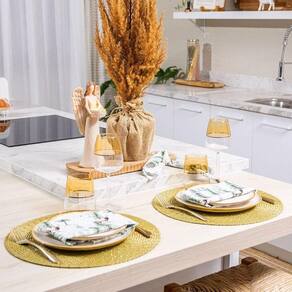 Jogo Americano Copa E Cia Avulso Greta Sun Jogo Americano Copa e Cia Avulso Greta Sun - Características Gerais do Produto: - Composição: 75% Polipropileno (Plástico) e 25 % Poliéster. - Detalhes: Flexível.; Peça Vendida de Forma Avulsa (Individual).; Armazenar o produto aberto e na horizontal; São práticas e versáteis; As cores podem sofrer pequenas alterações de cor, variando de monitor para monitor.; Os objetos que ambientam as fotos não acompanham o produto.; As fotos produzidas são apenas como sugestão de uso com as demais peças da coleção. - Cuidados: Limpar Manualmente, Armazenar em Local Seco e Arejado.; Não Torcer, Amassar, Dobrar ou Molhar Totalmente o Produto.; Limpar o Produto Apenas com Pano Levemente Umedecido; Evitar contato com objetos cortantes ou superaquecidos.; Não utilizar solventes, abrasivos ou alvejantes. - Dimensões (cm): Diâmetro: 38 cm Acompanha o produto: - 1 Peça de Jogo Americano Garantia: - 7 dias/30 dias contra defeito de fabricação