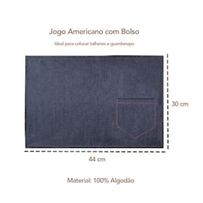 Contêm: Jogo Americano com Bolso Jogo de 4 peças Dimensões: 30 x 44 cm Composição: Jeans e algodão Obs: Os utensílios da foto são meramente ilustrativo e não acompanha a peça