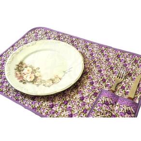 Jogo americano fabricado em tecido estampado, nas cores branca, roxa e lilás, com estampa de flores, detalhe tipo bolso para guardar os talheres com lese na cor lilás com bolinhas brancas e acabamento em viés na cor lilás.