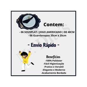 Itens Inclusos: - 06 SOUSPLAT ( JOGO AMERICANO ) DE 40CM - 06 Guardanapos 35cm x 35cm