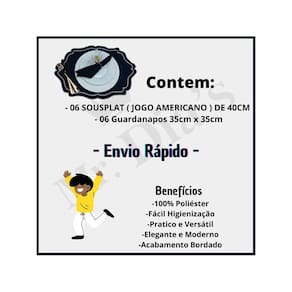 Itens Inclusos: - 06 SOUSPLAT ( JOGO AMERICANO ) DE 40CM - 06 Guardanapos 35cm x 35cm