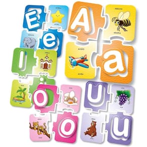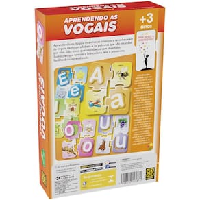 Aprendendo as Vogais é um jogo educativo da marca Grow que incentiva as 387 crianças a reconhecerem e memorizarem as vogais do alfabeto de maneira interativa. Composto por cinco quebra-cabeças coloridos, cada um contendo quatro partes, as crianças são introduzidas a palavras que começam com as vogais, facilitando a associação e fixação do conteúdo.