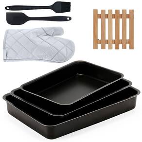 01 Assadeira N1 01 Assadeira N2 01 Assadeira N3 01 Luva Térmica de Cozinha 01 Pincel Culinário de Silicone 01 Descanso de Panela 01 Espátula de Silicone
