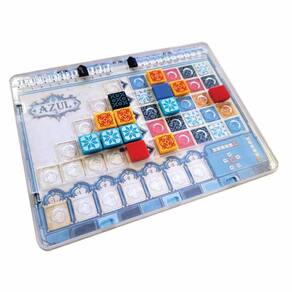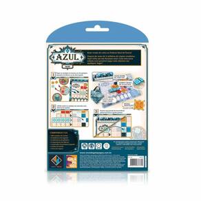 Bem-vindo de volta ao Palácio Real de Évora A nova versão do clássico jogo abstrato Azul traz a experiência do jogo dentro de um formato Mini. Sobre Azul Azul foi concebido pelo famoso e premiado game designer Michael Kiesling. O jogo captura a bela estética da arte moura num jogo de tabuleiro contemporâneo. De 2 a 4 jogadores competem como artesãos, decorando as paredes do Palácio Real de Evora. Escolhendo com cuidado a quantidade e estilo corretos de azulejos, os artesãos mais astutos planejam suas paredes para maximizar a beleza de seu trabalho sem contar suas pontuações , enquanto tentam garantir que nenhum recurso seja perdido no processo. Lançado em 2018, Azul se tornou um dos jogos mais populares do ano, vencendo inclusive o maior prêmio de jogo do ano do mundo, o prestigiado Spiel des Jahres.