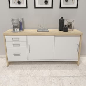 O balcão possui uma prateleira interna para armazenar documentos, utensílios de sua preferência.