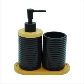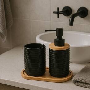 Sofisticação nos detalhesO Kit Lavabo Frisado é sinônimo de requinte e modernidade. Seu design elegante conta com relevos horizontais simétricos, criando um efeito visual sofisticado e harmonioso. O acabamento fosco adiciona um toque de luxo, enquanto a base de bambu traz equilíbrio e aconchego.Destaques desse modelo:-Textura frisada horizontal- um toque moderno e sofisticado-Acabamento fosco premium - discreto, elegante e atemporal-Base de bambu sustentável - charme e harmonia para o ambienteIdeal para quem busca um lavabo elegante, organizado e cheio de estilo.Especificações Técnicas:Cor: Preto- Porta Sabonete LíquidoMaterial: Porcelana e BambuMedidas Aproximadas: Altura: 12 cm x Diâmetro: 7cm- Porta ObjetosMaterial: PorcelanaMedidas Aproximadas: Altura: 10 cm x Diâmetro: 7cm- Bandeja:Material: BambuMedidas Aproximadas: Altura: 0,9 cm x Largura: 9 cm x Comprimento: 17 cmImagens IlustrativasComposição da Embalagem:1 Porta Sabonete Líquido1 Porta Objetos1 Bandeja Marca: Não Informado Ean: 7901010100014