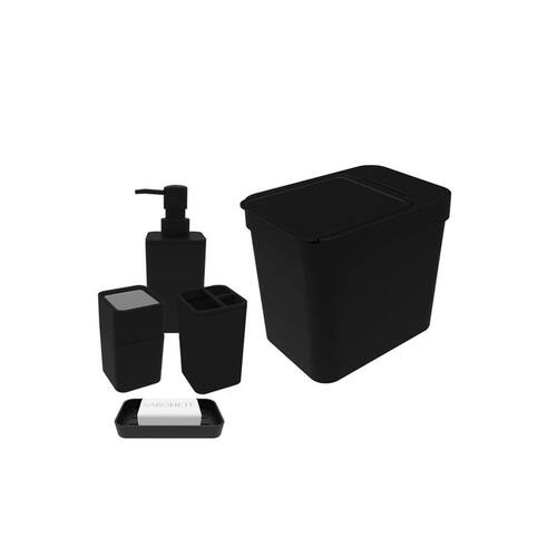 Contêm: 1 Dispenser Líquido Medidas: 17 x 7 cm 1 Porta Escovas Medidas: 11,3 x 7 cm 1 Porta Algodão Medidas: 11,3 x 6,8 cm 1 Saboneteira Medidas: 14,3 x 7,3 x 2,5 cm 1 Lixeira de 5 litros Dimensão: 22,4 x 15,8 x 25,5 cm Material: Polipropileno Casacha é uma loja virtual com artigos de organização para casa, escritório, banheiro e lavanderia.