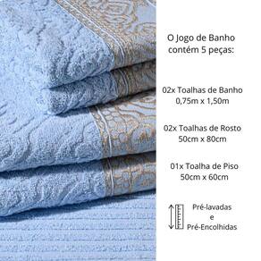Contém: 05 Peças 02 Toalhas de banho gigante 0,75x1,50m 02 Toalhas de Rosto 0,50x0,80m 01 Piso Toalha 0,50x0,60m