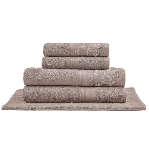 Possuem alta absorcao, e seu volume destaca um tom de charme e nobreza, proporcionando uma linda exposicao no banheiro, trazendo refinamento e muita sofisticacao ao ambiente. Composição 100% algodao Contem 5 pecas 02 toalhas banhao 81 x 150 cm 02 toalhas rosto 50 x 80 cm 01 piso Domus 50 x 80 cm Marca: Não Informado