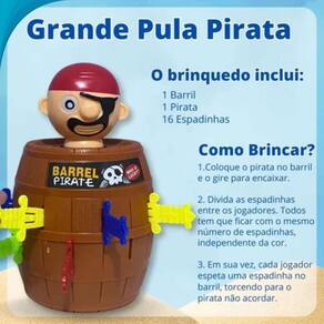 Jogo barril do pirata infantil presente de natal Barril pirata O barril do pirata é um brinquedo clássico e superdivertido que garante risadas e emoção para toda a família. O objetivo é simples: cada jogador insere uma espada no barril e, a qualquer momento, o pirata pode saltar para fora, surpreendendo a todos um jogo de sorte e suspense que estimula a interação, a concentração e a coordenação motora das crianças. Ideal para brincar em grupo, em festas, encontros familiares ou como presente no dia das crianças, natal e aniversários. Conteúdo da embalagem 1 barril do pirata 1 boneco pirata 24 espadas coloridas Características Brinquedo interativo e educativo Estimula a coordenação motora e a atenção Ideal para brincar em grupo e em família Fácil de jogar, não requer montagem complexa Design colorido e divertido que chama a atenção das crianças Perfeito como presente para meninos e meninas Especificações Material: plástico resistente e atóxico Idade recomendada: a partir de 3 anos Número de jogadores: 2 ou mais Dimensões aproximadas do barril: 15 cm x 10 cm Cores das espadas: variadas Produto leve e portátil Garanta já o barril do pirata e proporcione momentos de diversão, suspense e muitas risadas para toda a família Marca: Não Informado