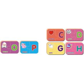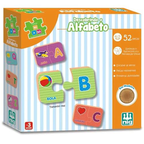 Material didático para crianças em fase pré-escolar; indicado nas listas de material das escolas. Esse jogo traz a associação de cada letra do alfabeto ao objeto que começa com a mesma letra. Encaixes diferentes. Contém 52 peças grandes em madeira reciclada, coloridas e resistentes.