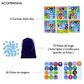 Conteúdo da Embalagem: 6 cartelas dupla face, 26 fichas de imagens, 72 fichas de bingo e 01 Bolsa para armazenar as fichas.