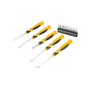 Indicado para Fixar e Soltar Porcas e Parafusos em Geral, Retirar Anéis de Borracha e Minifusíveis Produzido em Aço Cromo Vanádio de Alta Resistência e Durabilidade Tipo de Encaixe dos Bits: Sextavado 1/4'' 6,35 mm Comprimento Total dos Bits: 25 mm Jogo com 17 Peças 1 Estojo Plástico 1 Ponta Reta 1 Ponta Curva 1 Ponta L 1 Ponta 45 1 Cabo Adaptador para Bits 3 Bits Phillips PH000, PH00 e PH0 3 Bits Fenda 2 mm 2,5 mm 3 mm 3 Bits Hexalobular T5 T6 T7 3 Bits Allen 1,3 mm 1,5 mm 2 mm