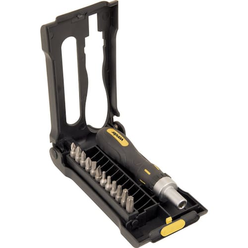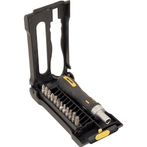 Conteúdo: 1 Jogo de bits/ponteiras, composto por um estojo plástico com 13 peças, sendo: 2 pozidrive PZ1 e PZ2 , 2 phillips PH1 e PH2 , 2 fenda 4,5 mm e 5,5 mm , 6 torx T10, T15, T20, T25, T30 e T40 e 1 cabo adaptador emborrachado com catraca Ean: 7893946135799