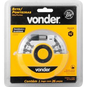 1 Jogo de bits/ponteiras, composto por 26 peças, sendo: 4 bits pozidrive 25 mm (1 PZ1, 2 PZ2 e 1 PZ3), 4 bits phillips 25 mm (1 PH1, 2 PH2 e 1 PH3), 4 bits allen 25 mm (3 mm, 4 mm, 5 mm e 6 mm), 6 bits hexalobular 25 mm(T15, T20, T25, T27, T30 e T40), 7 bits fenda 25 mm (1 de 3 mm, 2 de 4 mm, 1 de 5 mm, 2 de 6 mm e 1 de 7 mm) e 1 extensão magnética (60 mm).