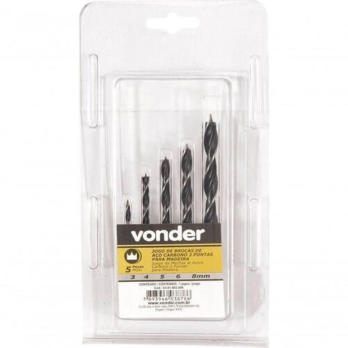 Jogo Broca 3 Pontas Aço Carbono 3 à 8mm Para Madeira Com 5 P Conteúdo da embalagem 1 Jogo de brocas 3 pontas com 5 peças, sendo: 3,0 mm - 4,0 mm - 5,0 mm - 6,0 mm e 8,0 mm Aplicações e dicas de uso Indicado para madeira e derivados Destaques e diferenciais Possui ponta com afiação especial que facilita a centralização do furo. Oferece bom acabamento nos mais variados trabalhos em madeiras e derivados. Possui estojo plástico, que facilita a acomodação, organização. DETALHES TÉCNICOS