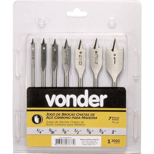 Jogo Broca Chata Aço Carbono 1/4-1 Para Mad Com 7 Pç Vonder Conteúdo da embalagem 1 Jogo de brocas chatas com 7 peças, sendo: 1/4 - 5/16 - 3/8 - 1/2 - 5/8 - 3/4 e 1 Aplicações e dicas de uso Indicado para chapas finas de madeira e derivados Destaques e diferenciais Possui ponta com afiações especiais, que facilitam a centralização do furo. Estojo plástico que facilita a acomodação, organização. DETALHES TÉCNICOS