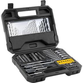 1 Jogo de bits/ponteiras e brocas, composto por 1 maleta plástica com 82 peças, sendo: 1 adaptador magnético 60 mm, 2 bits fenda 50 mm (5 mm e 6 mm), 3 bits phillips 50 mm (PH1, PH2, PH3), 3 bits pozidrive 50 mm (PZ1, PZ2, PZ3), 8 bits phillips 25 mm (2 - PH0, 2 - PH1, 2 - PH2 e 2 - PH3), 8 bits fenda 25 mm (2 de 3 mm, 2 de 4 mm, 2 de 5 mm e 2 de 6 mm), 8 bits pozidrive 25 mm (2 - PZ0, 2 - PZ1, 2 - PZ2 e 2 - PZ3), 6 bits hexalobular 25 mm (T10, T15, T20, T25, T27 e T30), 6 bits allen 25 mm (2 de 2,5 mm, 1 de 3 mm, 1 de 4 mm, 1 de 5 mm e 1 de 6 mm), 5 soquetes sextavados (6 mm, 7 mm, 8 mm, 9 mm e 10 mm), 1 chave allen 2,5 mm, 3 limitadores de profundidade para broca de 5 mm, 6 mm e 8 mm, 1 escariador com 10 mm de diâmetro por 30 mm de comprimento, 1 gabarito para verificação da medida da broca de 1,5 mm a 6,5 mm, 4 brocas chata para madeira (13 mm, 16 mm, 19 mm e 22 mm), 5 brocas com 3 pontas para madeira (4 mm, 5 mm, 6 mm, 8 mm e 10 mm), 11 brocas de aço rápido (1,5 mm, 2 mm, 2,5 mm, 3 mm, 3,5 mm, 4 mm, 4,5 mm, 5 mm, 5,5 mm, 6 mm e 6,5 mm), 6 brocas de vídea para concreto (4 mm, 5 mm, 6 mm, 7 mm, 8 mm e 9 mm)