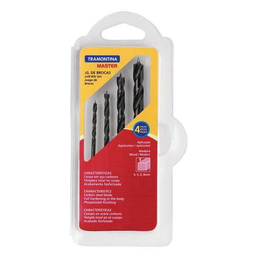 Jogo Brocas Para Madeira 4 Peças Tramontina 43408509 Características: - Corpo em aço especial. - Têmpera total no corpo. - Acabamento fosfatizado. - As ferramentas são submetidas a testes de aplicação prática para garantir sua resistência mecânica em uso intenso. - Utilizada em trabalhos de perfuração em madeira - As ferramentas são produzidas e testadas conforme normas específicas. - Conteúdo: 4 brocas de 4, 5 6 e 8 mm. Ean: 7891114094084