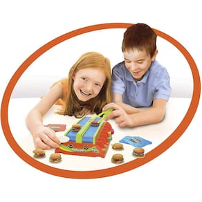 Quão rápido você pode construir um hambúrguer? Burger Mania combina movimento e habilidade para uma experiência de jogo divertida, envolvente e gratificante. 2 jogadores correm para construir um hambúrguer personalizado a partir do cartão de receita que escolher! Pães, alface, queijo, tomate? O que tem no seu hambúrguer? Trabalhe o mais rápido que puder para terminar de construir seu hambúrguer antes que ele chegue ao final da esteira transportadora em movimento ou você terá que começar de novo! O chef que prepara mais hambúrgueres ganha. Com 3 níveis de dificuldade, este é um jogo que as crianças vão jogar de novo e de novo. Avance para o próximo nível de habilidade à medida que você se torna mais eficiente com suas habilidades de construção de hambúrgueres. Além disso, o Burger Mania ajuda as crianças a desenvolver e refinar habilidades motoras finas e destreza, pois os jogadores devem usar pinças para construir seus hambúrgueres pedidos!