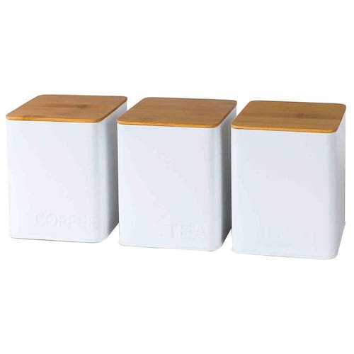 Jogo com três latas quadradas com cantos arredondados em metal na cor branca com as palavras COFFEE,SUGAR e TEA (significado em português: CAFÉ, AÇÚCAR e CHÁ) em alto relevo, tampas em bambu de encaixe, pintura interna da lata na mesma cor branca da parte externa.