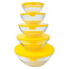 Jogo c/5 porta mantimentos de vidro tigelas potes com tampa Cor: amarelo Nome do produto: jogo c/5 porta mantimentos de vidro tigelas potes com tampa Jogo de potes de vidro 5 peças ad-0147