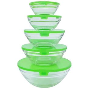 Jogo c/5 porta mantimentos de vidro tigelas potes com tampa, 5 unidades de potes em vidro com tampa em plástico colorida em 5 tamanhos diferentes: 900ml, 500ml, 330ml, 230ml, 130ml.