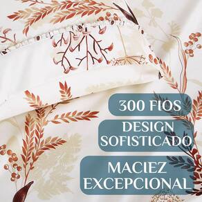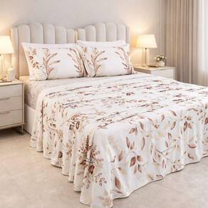 O kit é composto por 1 lençol de baixo com elástico, 1 lençol de cima estampado e 2 fronhas, todos no tamanho Queen. Produzido com 300 fios, oferece o equilíbrio perfeito entre suavidade e durabilidade, sendo confortável em todas as estações do ano.