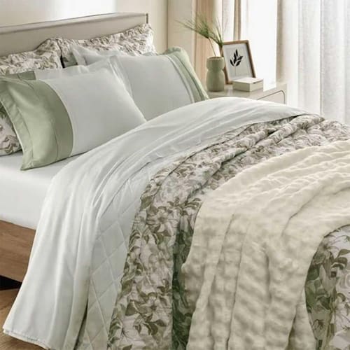 Acabamento Sobre lençol estampado com dobra feita e bainha comum; Lençol com elástico estampado; Fronha estampada com 3 abas de 5cm e detalhe contrastante na cor verde Eucalipto; Toque Supremo; Altamente respirável; Fácil de passar; Natural; Maleável e com ótimo caimento; Visual com leve brilho Marca: Não Informado