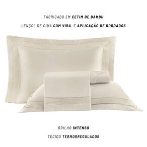 A tonalidade elegante bege é versátil, permitindo que se adapte facilmente a qualquer estilo de decoração, enquanto os bordados refinados trazem um toque de sofisticação artesanal para a sua cama. Cada peça é trabalhada com bordado delicado de 12,5cm nas fronhas e lençol superior, que adiciona elegância e exclusividade ao conjunto.