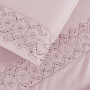 O Jogo de lençol para cama King com 04 peças confeccionado em tecido Micropercal 200 fios, detalhes em bordado inglês na fronha e no lençol de cima. Possui alto padrão de qualidade, proporciona conforto e sofisticação.