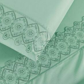 Jogo Cama Lençol Bouclê Casal Padrão Micro Percal 200 Fios c/ Laise Bordada 4 Peças - Verde Salvia - Única