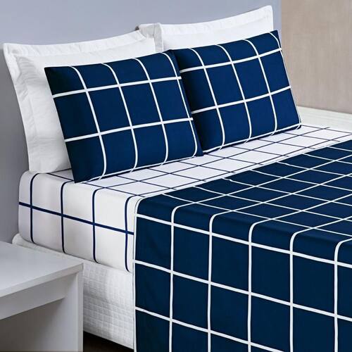 Jogo Cama Lençol Brooklyn Solteiro Quadriculado Micropercal 200 Fios 3 Peças - Azul Marinho