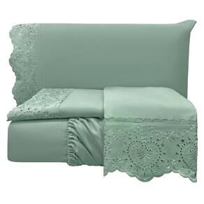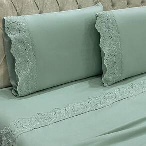 Jogo Cama Lençol Detail King Bordado Guipir Bordado Inglês Percal 300 Fios 4 Peças - Verde Menta O Jogo de Cama Lençol Detail é a escolha perfeita para quem busca elegância e conforto em cada detalhe. Feito em Percal de Poliéster 300 Fios, traz a suavidade e o toque acolhedor de algodão para noites de sono agradáveis e revigorantes. Seu design sofisticado com bordado inglês adiciona charme ao quarto, elevando a decoração com um toque clássico. Além disso, o lençol de baixo com elástico garante um ajuste perfeito ao colchão, proporcionando praticidade e durabilidade. Transforme seu quarto em um ambiente aconchegante e sofisticado com o Jogo de Cama Detail
