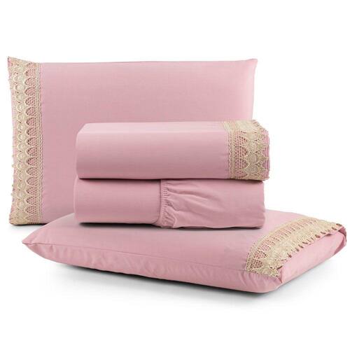 Jogo Cama Lençol Haia Queen Percal 200 Fios 100% Algodão Guipir Bordado Inglês 4 Peças - Rosê - Única